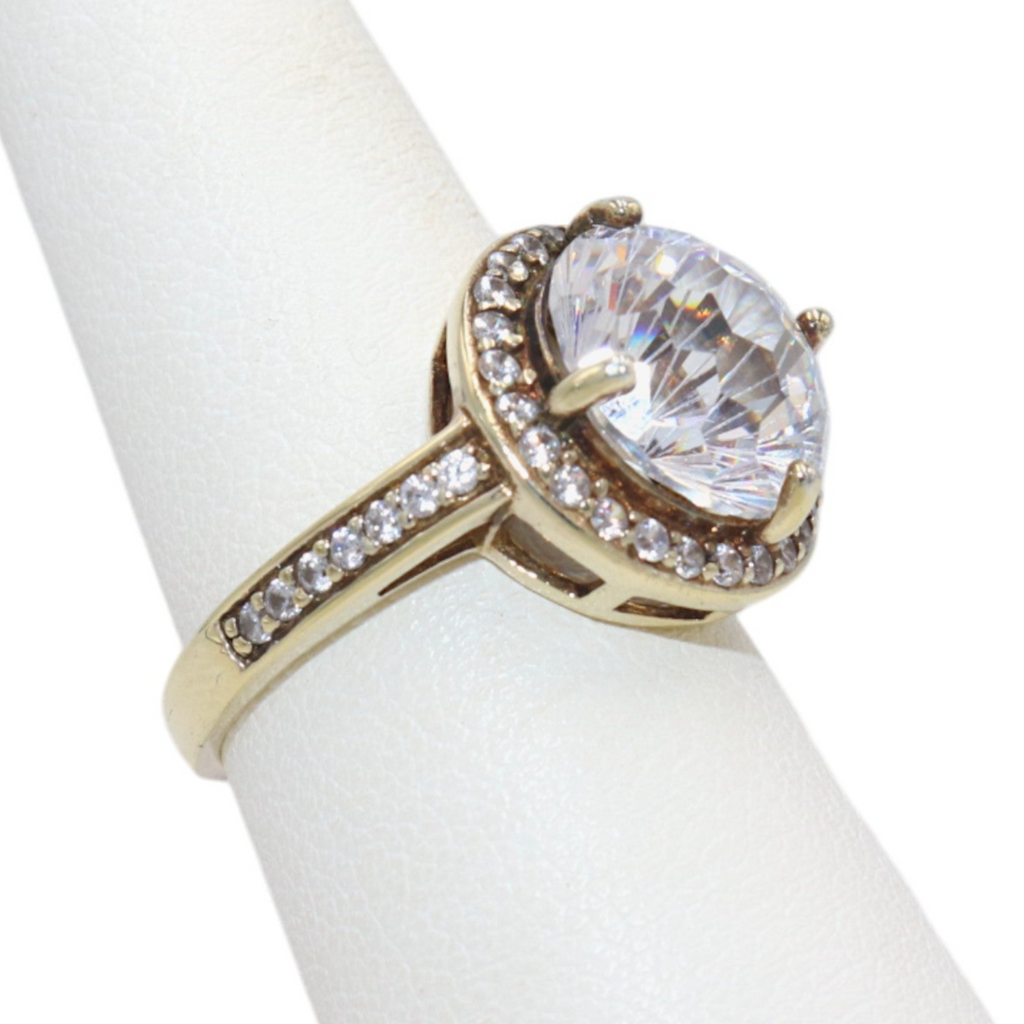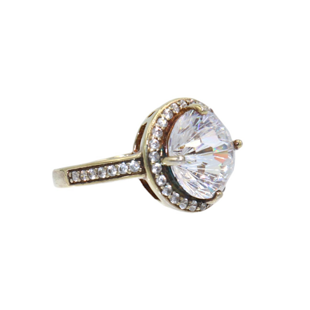 The band is adorned with additional small CZ stones, adding a touch of sophistication to the design. Sized at 6, this ring is perfect for making a bold and glamorous statement.