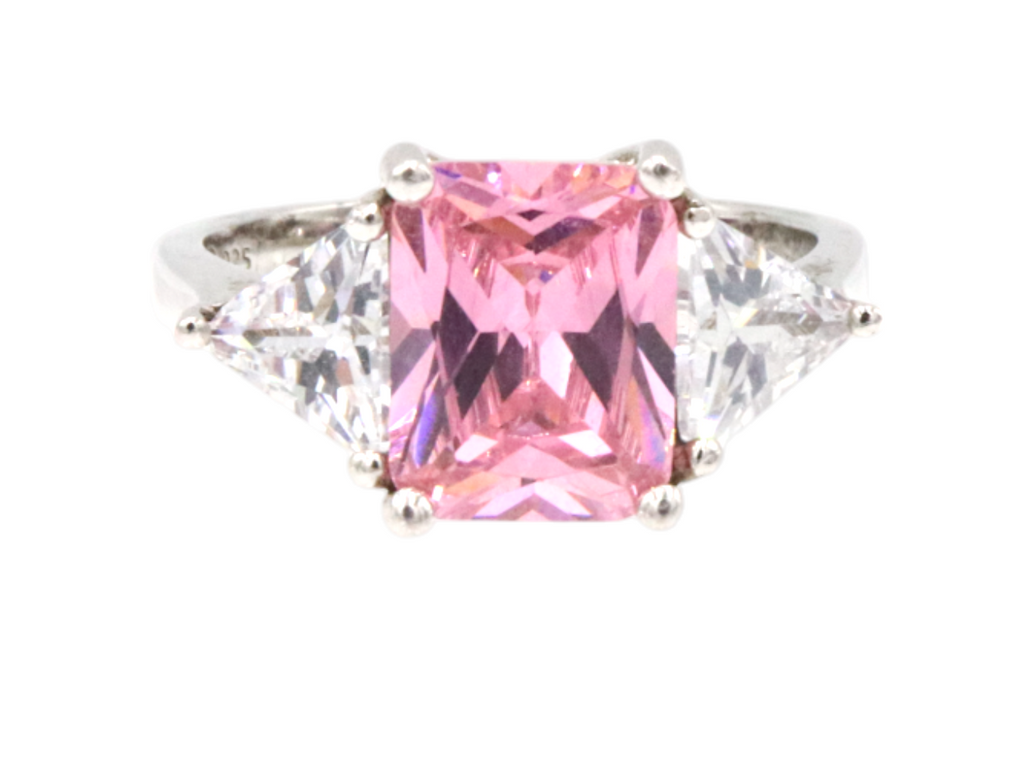 Unveil the elegance and charm of this exquisite bridal ring crafted from Silver 925. Its centerpiece showcases a stunning emerald-cut pink CZ, elegantly accompanied with sparkling white CZ stones. This ring is sized perfectly at 8 and promises to enhance any bridal ensemble with timeless beauty. Ideal for those seeking a blend of sophistication and allure on their special day.