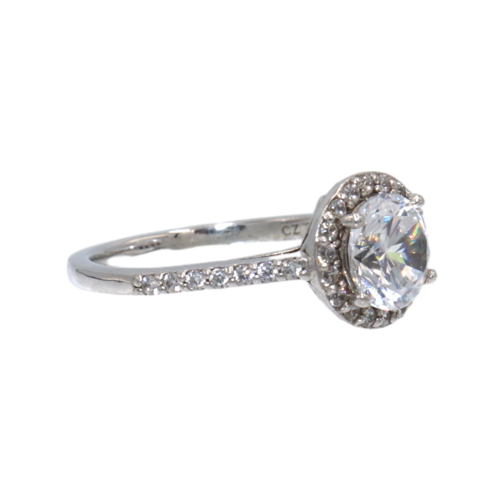 Introducing our stunning Silver 925 bridal ring, a perfect symbol of love and elegance. This exquisite piece features a dazzling round center stone, artfully surrounded by smaller cubic zirconia (CZ) stones, creating a brilliant halo effect. The delicate, thin band is adorned with additional small stones, adding a touch of sparkle from every angle. Designed in size 7, this ring offers a timeless beauty that will captivate hearts.