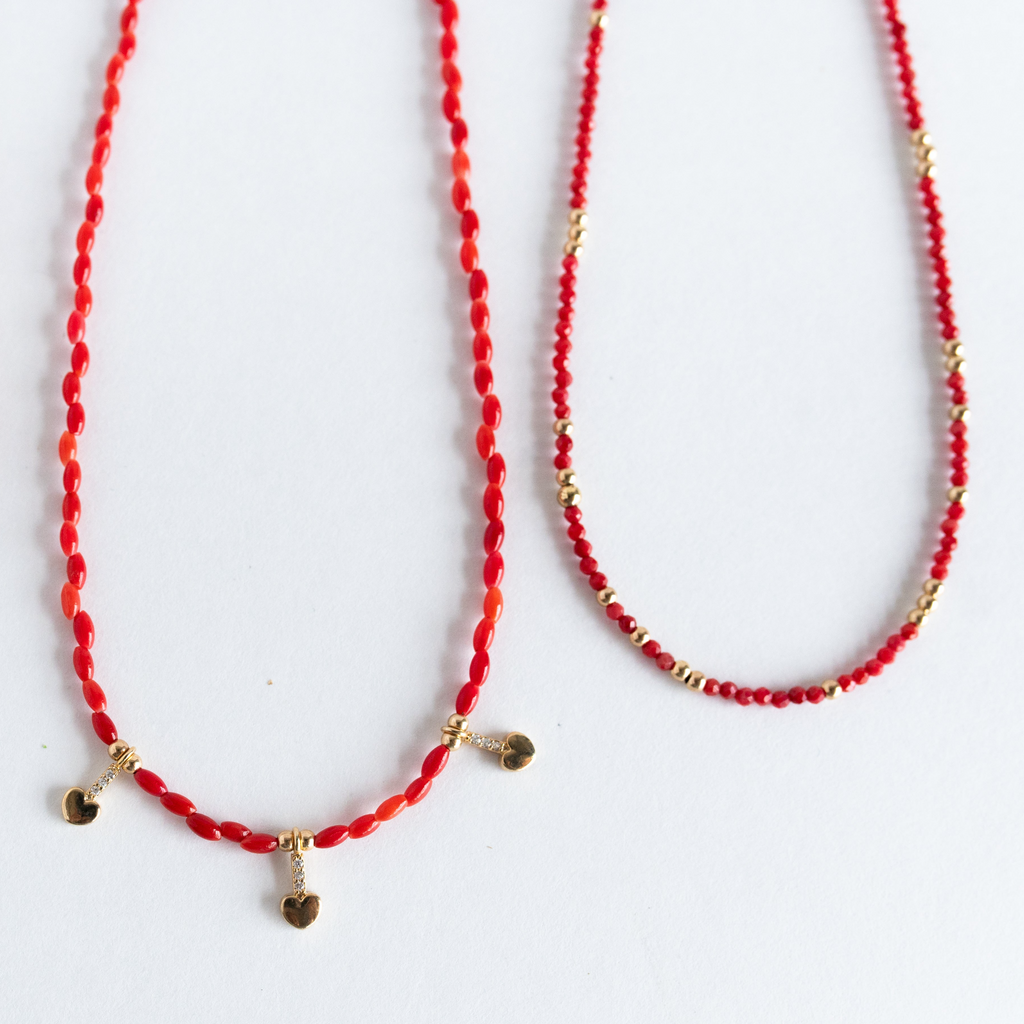 This semi-precious boho necklace in shade of coral is an ideal choice for women who appreciate simplicity and the allure of nature. Our necklace boasts a variety of charms, ranging from the timeless elegance of pearls to the dazzling brilliance of a zirconia heart. Elevate your style effortlessly blending natural beauty and refined simplicity.