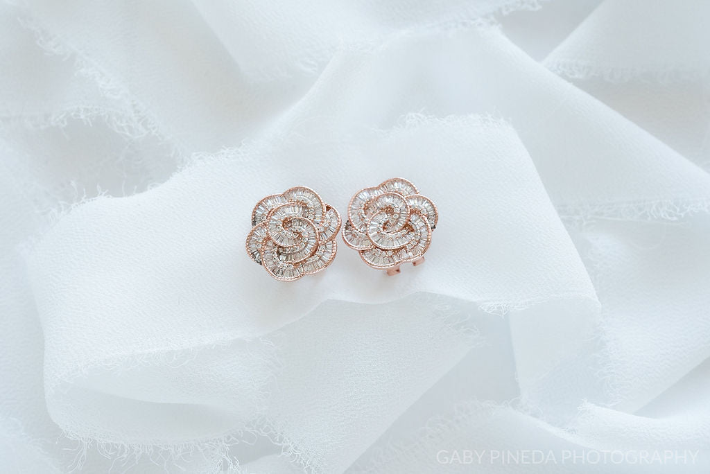 Elevate your style with our versatile Rose-shaped baguette stud earrings, designed to add a touch of sweet sparkle to any occasion. Whether you're walking down the aisle or attending a special event, these earrings offer a unique and elegant option for brides seeking something different for their dream day. With their eye-catching rose design, these studs are ready to complement all your favorite looks with timeless charm and sophistication.