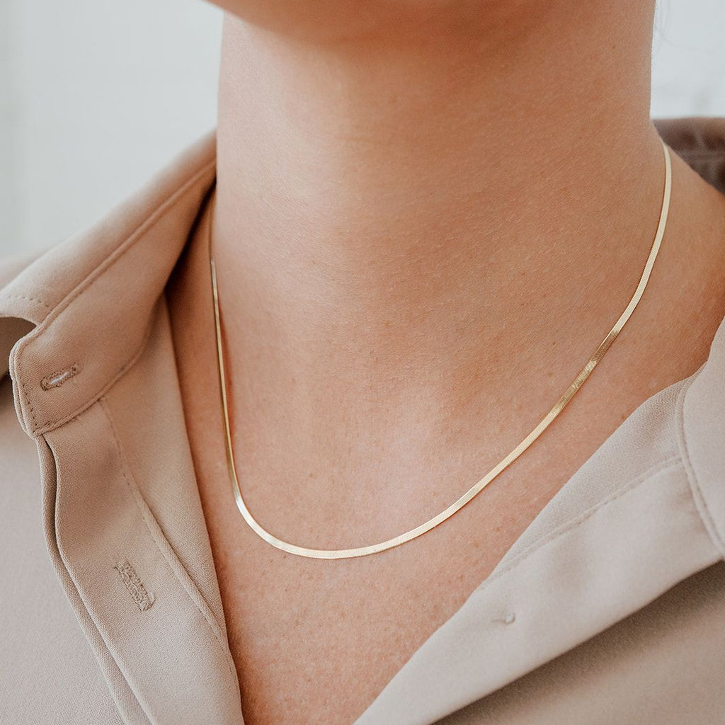 Elevate your style with this 14K gold Herringbone Chain Necklace, a timeless piece that exudes effortless elegance. Crafted with a smooth, reflective finish, this necklace lays beautifully against the skin, adding a sleek, sophisticated touch to any look. Perfect for layering or wearing solo, it’s a must-have staple for every jewelry collection and ideal for both everyday wear and special occasions.
