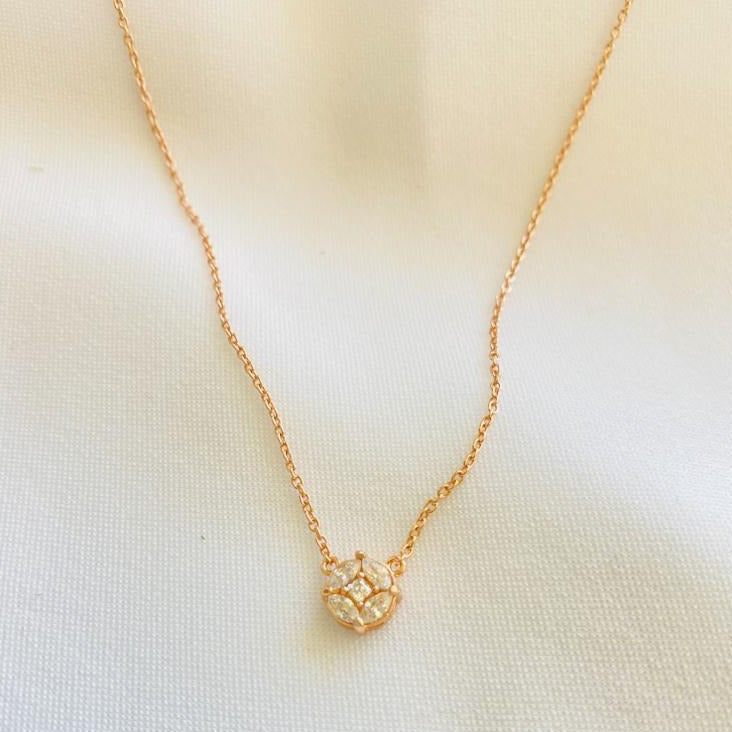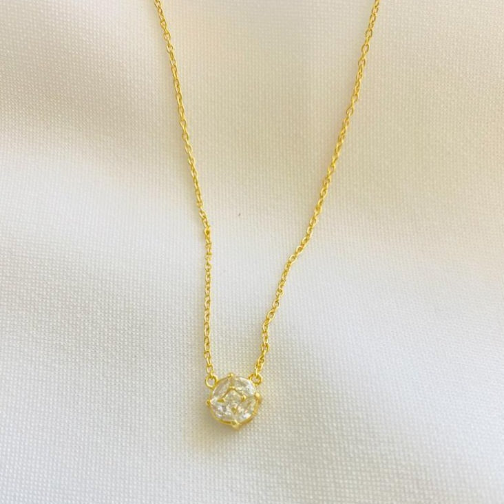 Elevate your ensemble with our exquisite Tiny Round Nadja Cluster Necklace, designed to add the perfect touch of sparkle to your neckline. Crafted with precision and adorned with dazzling marquise stones, this delicate piece is the ideal complement for outfits that require a subtle yet captivating detail. Whether you're a modern minimalist or a timeless woman, this necklace exudes sophistication and charm, offering a timeless look that transcends trends. Make a statement with elegance and grace with our stunning Tiny Round Nadja Cluster Necklace.
